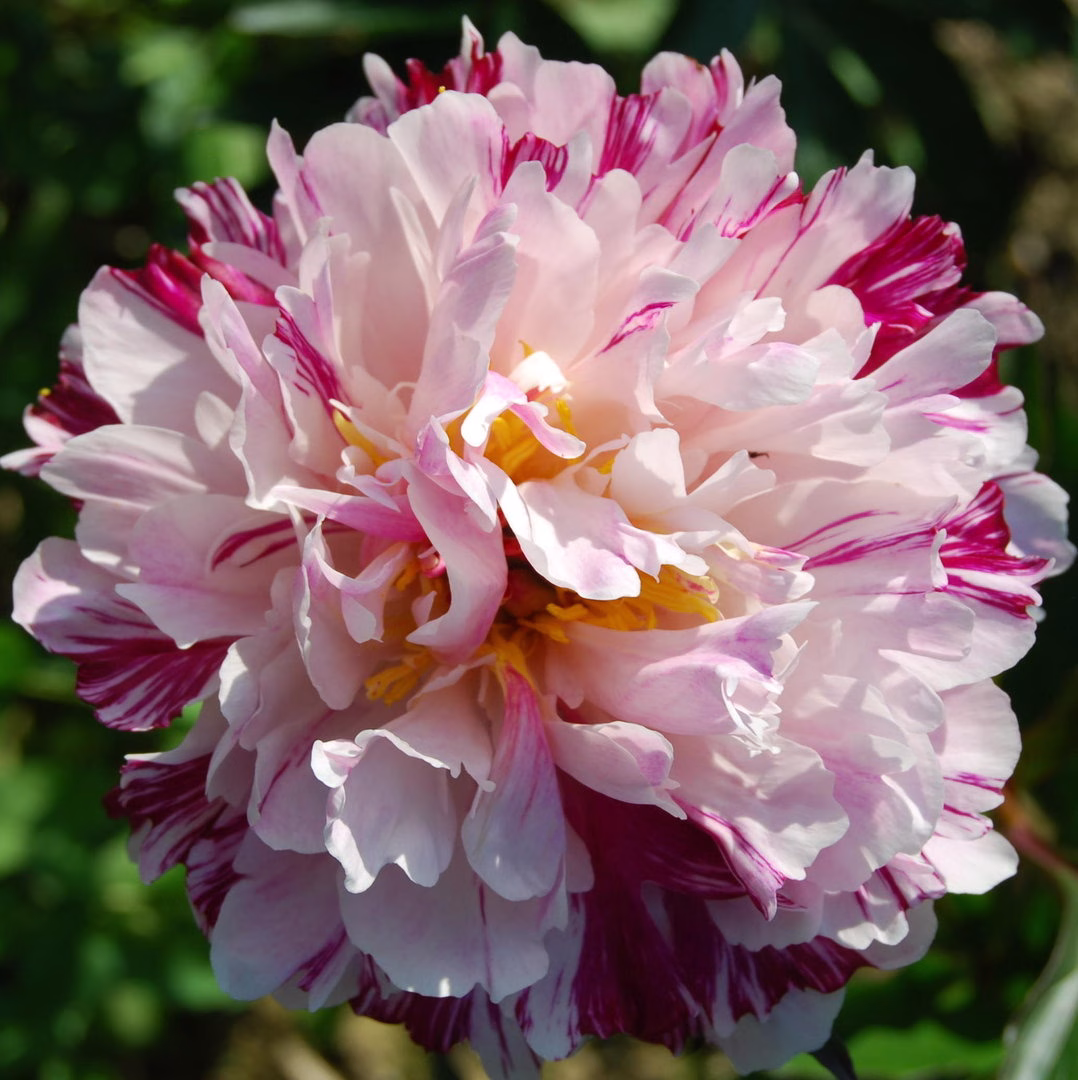Die Pfingstrose „Candy Stripe“ ist eine optische Sensation und bringt pure Lebensfreude in den Garten. Wie ihr Name vermuten lässt, erinnert ihr Aussehen an traditionelle Zuckerstangen: Die großen, gefüllten Blüten haben eine cremeweiße Basis, die mit unregelmäßigen, leuchtend himbeerroten Streifen und Sprenkeln durchzogen ist. Jede Blüte ist ein Unikat – keine zwei Blumen weisen exakt dasselbe Muster auf. Diese Sorte ist ein absoluter Magnet für alle, die das Extravagante lieben.