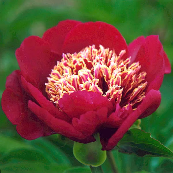 Die Pfingstrose „Charles Burgess“ ist ein Meisterwerk der Kontraste. Sie gehört zum Typ der japanischen Pfingstrosen, die für ihre filigrane Mitte berühmt sind. Die Blüte besticht durch eine Schale aus tiefen, weinroten bis purpurfarbenen Außenblättern, die ein spektakuläres Zentrum umschließen. In der Mitte thronen zahlreiche schmale „Staminodien“ (umgewandelte Staubblätter), die in einem kräftigen Burgunderrot leuchten und an den Spitzen mit leuchtendem Bronze verziert sind. Diese Kombination wirkt wie ein edles Juwel in einer Samtschatulle.