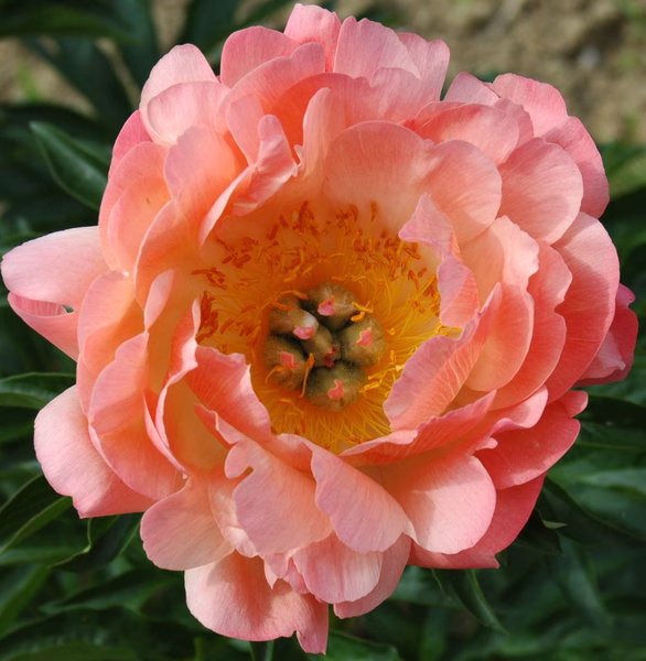 Die Pfingstrose „Coral Sunset“ ist ein preisgekröntes Meisterwerk der Natur. Sie macht ihrem Namen alle Ehre, indem sie das gesamte Farbspektrum eines wunderschönen Sonnenuntergangs in den Garten bringt. Die Blüte öffnet sich in einem tiefen, leuchtenden Korallen-Orange und wandelt sich über Tage hinweg in zarte Schattierungen von Lachs, Apricot und schließlich Elfenbein. Diese Sorte gilt als die farbstärkste und am besten wachsende unter den korallenfarbigen Pfingstrosen.