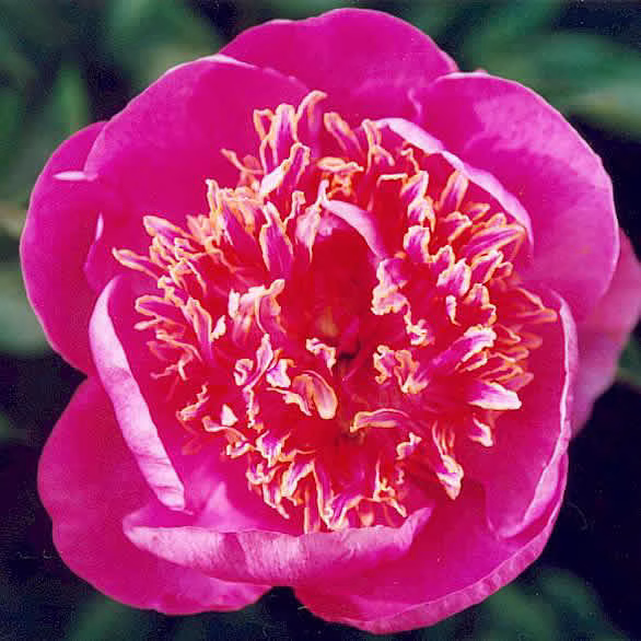 Die Pfingstrose „Neon“ ist ein absoluter Blickfang und die perfekte Wahl für alle, die mutige, moderne Farben lieben. Diese Sorte gehört zum japanischen Typ und besticht durch eine außergewöhnliche Intensität: Große, breite Schutzpetalen in einem leuchtenden, kräftigen Pink-Magenta bilden eine Schale für ein spektakuläres Zentrum. Die Mitte ist dicht gefüllt mit schmalen Petaloiden, die ebenfalls in Magenta gehalten sind, aber an den Spitzen eine feine goldgelbe Randung aufweisen. Dieser Kontrast lässt die Blüte wirken, als stünde sie unter Strom – ein echtes Highlight für jeden Garten.